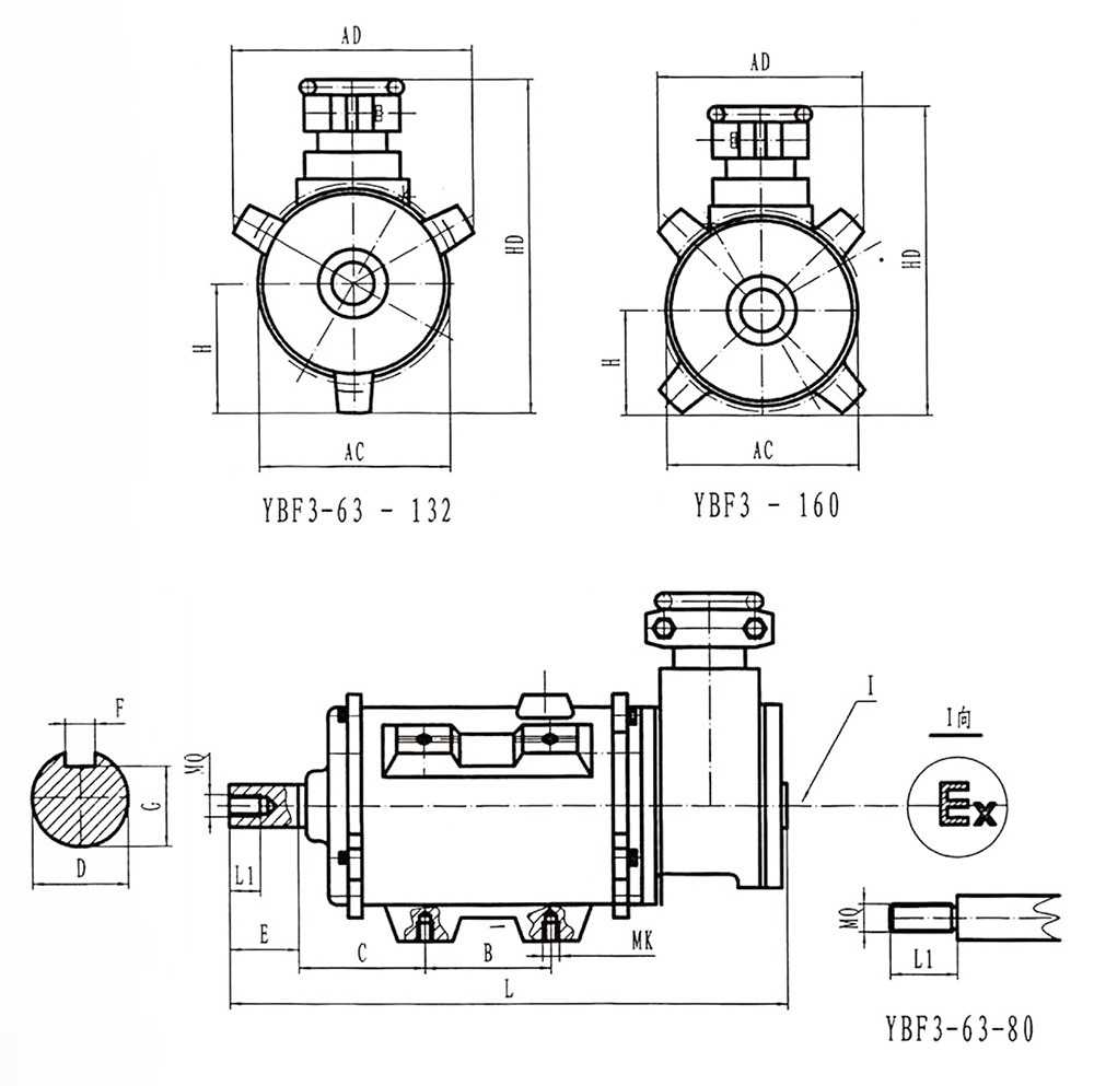 YBF3 explosion-proof motor is a new product designed and developed for ventilation fan. It has the characteristics of small size, light weight, high efficiency, low noise, low vibration, safe and reliable operation, easy operation and maintenance. YBF3 explosion-proof motor power level and installation dimensions conform to National Standards and the International Electrotechnical Commission IEC standards, reach the domestic first-class technical level. YBF3 flameproof three-phase asynchronous motor for fans implement the standard GB3836.2 Explosive Atmosphere Electrical Apparatus, Part 2, Apparatus with Flameproof Type “d” Enclosure , MT451-1995 Flameproof Low-voltage Three-phase Asynchronous Motor for Coal Mine General Technical Specification for Safety Performance". The main performance is in line with the provisions of "Flameproof three-phase asynchronous motor Technical conditions Part 5 YBF3 series fan flameproof three-phase asynchronous motor (frame No. 63-355)", the explosion-proof mark is Exdb LBT4, EXLBT4(original mark Exd). it mainly used as the prime motor of the fan. It is suitable for the place where the non-mining surface of coal mine has methane flammable gas or the explosive gas environment formed between coal mine and air.